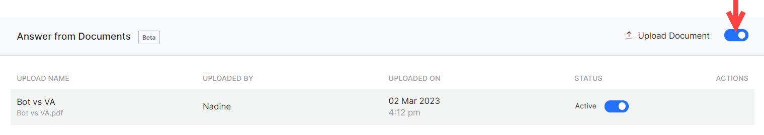 Disabled documents are not considered by the VA when providing answers, even if the Answer From Documents feature is active overall. As such, answers are only provided from uploaded documents that are active. To disable a document, toggle the Status to Inactive.Â