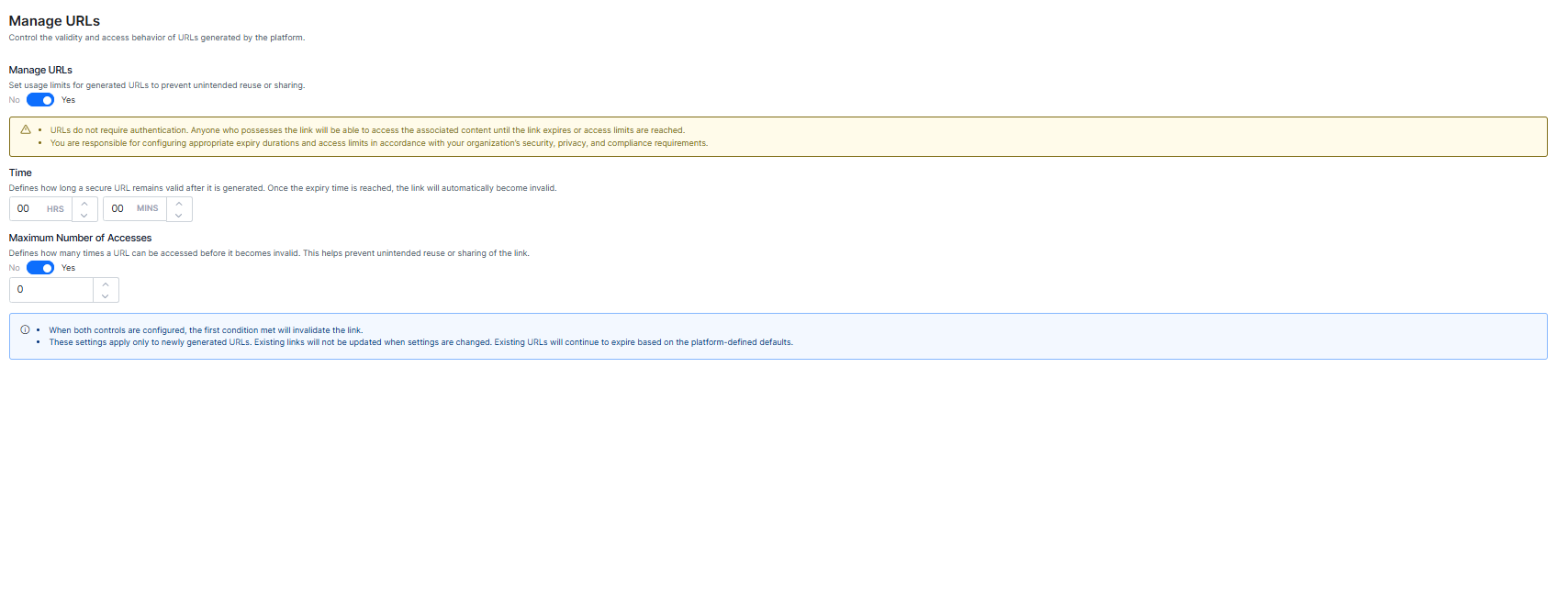 2. Enable the toggle under Manage URLs. This allows you to configure expiry time and access limits for newly generated URLs.