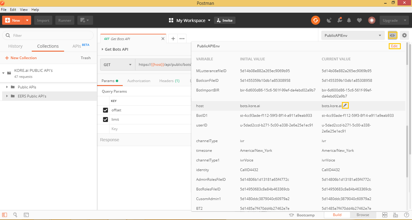 Postman은 기본적으로 키-값 쌍 집합인 설정 가능한 환경을 제공합니다. 이 도구를 사용하면 여러 요청에서 참조할 수 있는 자주 사용되는 변수를 생성할 수 있습니다. 여기에서 자세한 내용을 읽을 수 있습니다. 사전 설정 'PublicAPIEnv' 환경에는 컬렉션에서 참조하는 대략적인 변수 집합이 포함되어 있습니다. 이러한 변수를 편집하여 사용자 고유의 값으로 교체합니다. 값을 편집하려면 다음을 수행합니다.