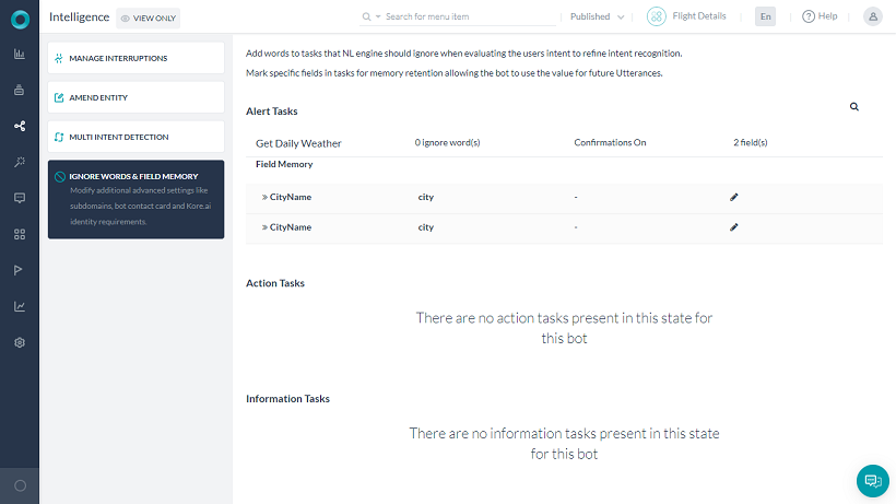 各タスクの [フィールドメモリ] 設定で、同じBotの別の関連タスクにそのタスクのデータを事前設定できるように各タスクを編集することができます。たとえば、テーマパークBotの「アトラクションの待ち時間を表示」タスクの場合、タスクフィールドを関連タスク「エクスプレス・パスを予約する」のアクションタスクに事前に組み込みことができます。また、タスクレベルでユーザー入力から除外するワードを設定することもできます。たとえば、「週間天気予報」タスクにはすべての曜日が対象として含まれているため、「月曜日」や「火曜日」といったワードを無視したい場合などです。