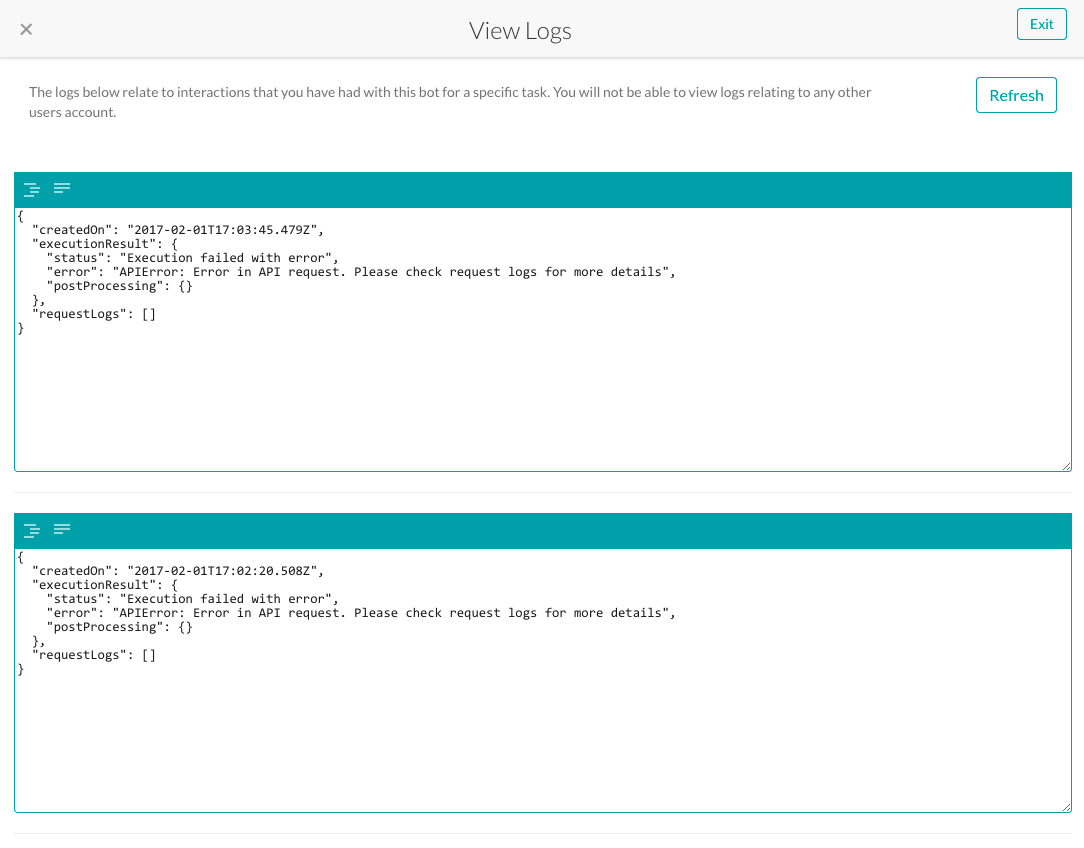 조치 작업의 문제를 해결해야 할 수도 있습니다. Kore.ai 봇 빌더 도구에서는 Kore.ai 봇 플랫폼 및 타사 애플리케이션과 상호 작용하는 설정된 조치 작업과 게시된 경고 작업에 대한 이벤트 로그를 볼 수 있습니다. 로그 보기 명령은 알림 작업 요청 및 애플리케이션 응답을 보는 데 사용할 수 있는 각 경고 작업 인스턴스의 아카이브된 로그 이벤트를 표시합니다. 조치 작업 섹션에서 로그를 보려는 작업의 설정 아이콘을 클릭한 다음 로그 보기를 클릭합니다. 봇 조치 작업에 대한 로그 보기 페이지는 다음 예시 조치 작업과 같이 표시됩니다. 로그 페이지 보기 필요한 경우 로그 보기 페이지에서 항목을 새로 고칠 수 있습니다. 각 로그 항목은 다음 Asana 봇 예시와 같이 조치 작업의 결과를 JSON 응답으로 나타냅니다.