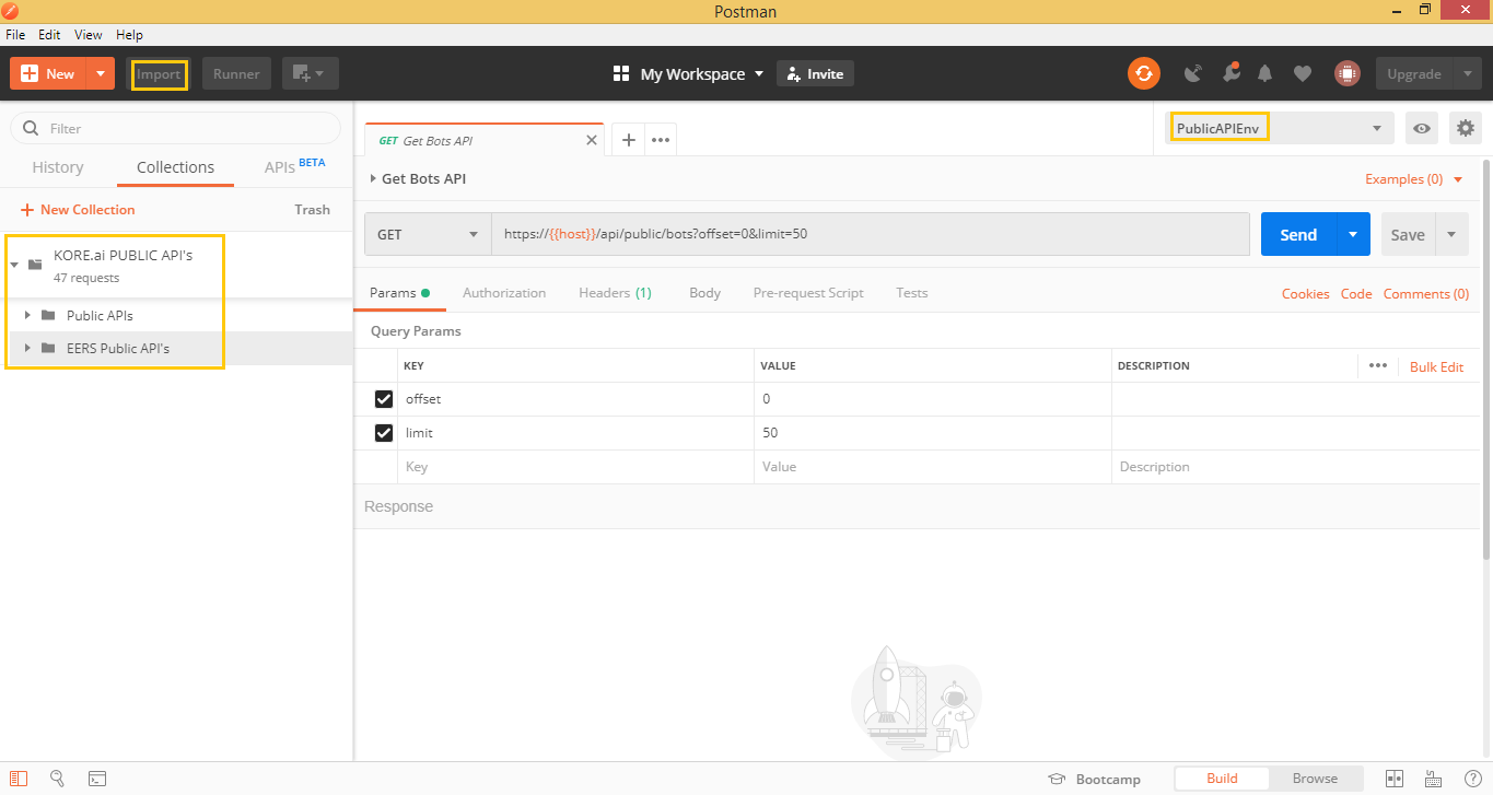 Postman이 실행되면 '가져오기'를 클릭하고 Postman 컬렉션 패키지에서 두 개의 JSON 파일을 선택할 수 있습니다. 가져온 후에는 컬렉션 아래에 'Kore.ai 공용 API'가 표시되고 아래와 같이 'PublicAPIEnv'를 환경으로 선택할 수도 있습니다: