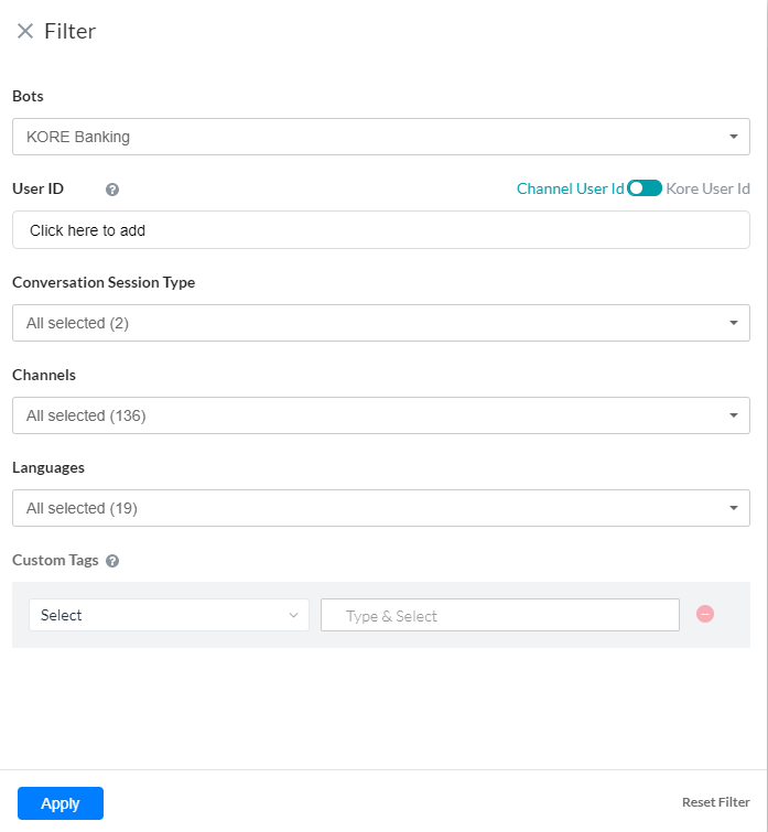 - Meta tags added at a message, user, or session levels. Multiple tag filters can be applied in a ‘AND’ condition. This option is available only when at least one bot is selected.